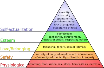 نظریه سلسله مراتب نیازهای انسانی مزلو (Hierarchy of Human Needs) معمولاً به شکل یک هرم متشکل از ۵ یا ۷ طبقه ترسیم میشود. این سلسله مراتب از نیازهای ابتدایی در طبقه پایینی شروع شده و هرچه بالاتر میرود نیازهای پیچیدهتر انسانی را معرفی میکند که به ترتیب عبارتاند از: نیازهای فیزیولوژیک، نیازهای امنیتی، نیازهای عاطفی، نیازهای اجتماعی-احترامی و نیازهای خودشکوفایی.[3]