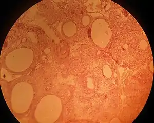 رشد بسیار آهستهای دارد. گاهی در این تومور مواد دنتوئید و به ندرت ماتریکس مینایی تولید میشود. از نظر کلینیکی بدون علامت میباشد یا اتساع بدون درد نشان میدهد. در نمای رادیوگرافی ۷۵% موارد رادیولوسنسی تک حفرهای پیرامون تاج دندان دیده میشود که گاهی به سمت اپیکال ریشه گسترش مییابد و از اتصال سمان- مینایی میگذرد که نوع فولیکولار نامیده میشود. دو سوم موارد با دندان نهفته (معملا کانین) مرتبط است. تفاوت آن با کیست دنتی ژروس این است که این تومور گسترش اپیکالی فراتر از اتصال سمان-مینایی دارد. بسیاری مواقع اشتباها کیست تشخیص داده میشود.[2]