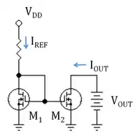 آینه جریان ساده نیز میتواند با استفاده از ترانزیستورهای ماسفت پیادهسازی شود، همانطور که در شکل ۲ نشان داده شدهاست. ترانزیستور M1 و همچنین M2 در حالت اشباع یا فعال عمل میکند. در این طرز قرارگیری، جریان خروجی IOUT بهطور مستقیم با IREF مرتبط است، همانطور که در ادامه بحث شده.