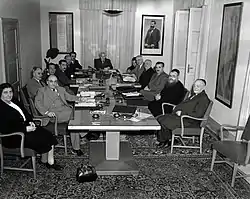 اولین دولت اسرائیل در ۱ مه ۱۹۴۹. چپ-راست: گلدا میر، زالمان شاذر، بچور-شالوم شیتریت، زوی میمون (متخصص نگارش دولت)، داو یوسف، الیازر کاپلان، موشه شارت، نخستوزیر دیوید بن گوریون، زئوف شرف (دبیر کابینه)، پینچاس روزن، دیوید ریمز، هایم موشه شاپیرا، ییتزاک میر لوین، یهودا لایب میمون .