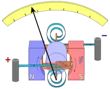 و باعث جمعشدن سیمپیچ میشود. جمع شدن سیمپیچ باعث به حرکت در آمدن نشانگر میشود که وابسته به جریان ورودی است.