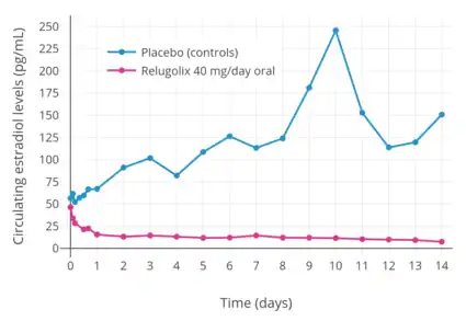 مصرف ۴۰ میلیگرم تکدوز از این دارو قادر است ظرف ۲۴ ساعت، سطح هورمون استرادیول را در زنان غیریائسه به کمتر از ۲۰ پیکوگرم در میلیلیتر (سطح هورمون در دوران یائسگی) برساند[1] و اگر دارو قطع شود، ۴ هفته طول میکشد تا هورمون استرادیول به سطح طبیعیاش بازگردد.[1] علاوه بر استرادیول، این دارو قادر است پروژسترون، هورمون لوتئینی و هورمون محرکه فولیکولی را در زنان غیریائسه کاهش میدهد.[1] مصرف ۴۰ میلیگرم یا بیشتر از رلوگولیکس در مردان، سطح هورمون تستوسترون را تا حد اختگی (کمتر از ۲۰ نانوگرم در دسیلیتر) پائین میآورد.[11] در مردان نیز این دارو هورمون لوتئینی و هورمون محرکه فولیکولی را کاهش میدهد.[11]