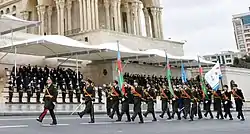 پرسنل نیروهای مسلح آذربایجان با پرچم پیروزی در میدان آزادلیق حرکت کردند، این پرچمی است که وقتی نیروهای آذربایجان کنترل شهر شوشا را در دست گرفتند، در شوشا نصب شدهاست.[44] به دنبال پرچم کشور و پرچم پیروزی، پرچمهای واحدهای نیروهای مسلح آذربایجان به میدان نزدیک شدند. پرچمهای نبرد واحدهای نظامی که در جنگ شرکت داشتند با هدایت سرلشکر زائر ممدوف از جلوی تریبون عبور کردند. فرماندهی رژه نیروهای مسلح آذربایجان توسط سرلشکر کریم ولی اف انجام شد. رهبر نظامی رژه، هنرمند ارجمند آذربایجان، سرهنگ دوم سرهنگ روفت آخوندزاده، پسر یوسیف آخوندزاده، که رئیس فعلی سرویس باند نظامی نیروهای مسلح است، بود.[45] نویسنده و مجری فیلمنامه رژه، هنرمند ارجمند آذربایجان، بازنشسته شخصی رئیسجمهور، سرهنگ عبدالله قربانی بود.[46]