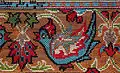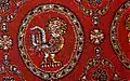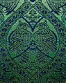 - بافندهٔ عصر سلجوقی علاقهای به رنگهای مجلل نداشت ولی تضاد سادهٔ سیر و روشن رنگها را بهخوبی تشخیص میداد. بافندهٔ این عصر فقط دو رنگ را ترجیح میداد، آبی کمرنگ یا سرمهای. سیاه و سبز را بر روی زمینهای به رنگ سفید یا سرخ بهکار میبرد. معمولاً طرح این پارچهها با نشانههای سلطنتی ایران یا علایم خانوادگی و سنن هنری قدیم ایران مانند عقاب، طاووس، شیر، ترنج یا هشتگوش، مرغابی، غاز، خرگوش و بوتههای نباتی تزیین میشد. بافندگان این دوره صحنههای لطیف و شاعرانه و مناظر طبیعی را از روی نقاشیهای معاصر خود تقلید میکردند. همچنین رنگهای آبی، زرد، سفید و سیاه را بهکار میبردند.[11]