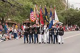 رژه نیروهای مسلح ایالات متحده آمریکا؛ با حمل پرچم آمریکا و ۵ پرچم، به نشانهٔ ۵ شاخه نظامی فعال در نیروهای مسلح این کشور