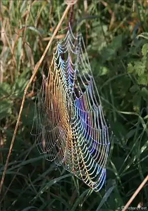قطرات شبنم که روی یک تار عنکبوت (یا ندرتاً روی دیوارها، علفها و دیگر پوششهای گیاهی) تشکیل میشوند، وقتی از تارها آویزان میشوند همانند باران عمل کرده و باعث شکست نور میشوند.