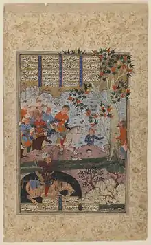 ![]() صحنهای از شاهنامه؛ مرگ رستم و کشتهشدن شغاد به دست او | |