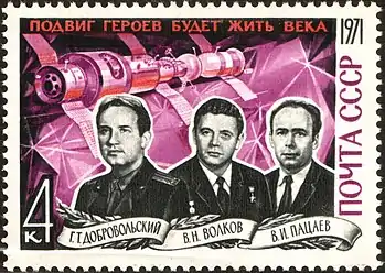 ![]() Patsayev (right) in a Soviet commemorative stamp issued in 1971 | |