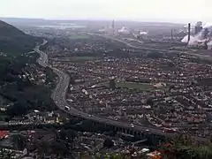 ![]() The elevated section of the آزادراه ام۴ above Port Talbot and the steelworks in the distance | |