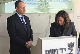 کامالا هریس در حال امضای دفتر یادبود ید وشم به همراه همسرش در سال ۲۰۱۷