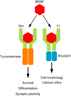 گیرندهٔ تیروزین کیناز B دارای میل ترکیبی زیادی برای اغلب نوروتروفین ها به خصوص فاکتور نورون زایی مشتق از مغز میباشد. علاوه بر آن نوتروفین ۳ و ۴ نیز با میل ترکیبی کمتر به آن متصل میشوند. گیرندههای تیروزین کینازی دارای مناطق فسفریله شونده هسند که در صورتی که پیش ماده به آنها متصل شود به صورت دوتایی درآمده و در نهایت فسفریلاسیون آنها سبب جذب پروتئینهای درون یاختهای و برقراری آبشارهای دون یاختهای میشود. گیرندههای انسولینی نیز کاری مشابه با این گیرندها دارند.