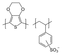 PEDOT:PSS یا پلی(3,4-ethylenedioxythiophene) پلی استایرن سولفونات پلیمری ترکیبی از دو یونومر است. بخشی از گروههای سولفونیل موجود در سدیم پلیستایرن سولفونات که یک جز از این پلیمر است دپروتونه شدهاند و حامل بار منفی هستند. دیگر جزء پلی(3,4-ethylenedioxythiophene) یا PEDOT یک پلیمرکونژوگه از خانوادهٔ [polythiopheneپلیتیوفنها] و حامل بارهای مثبت است. این دو جز که هریک ماکرومولکولهایی باردار هستند، با یکدیگر یک نمک ماکرومولکولی را تشکیل میدهند[1]